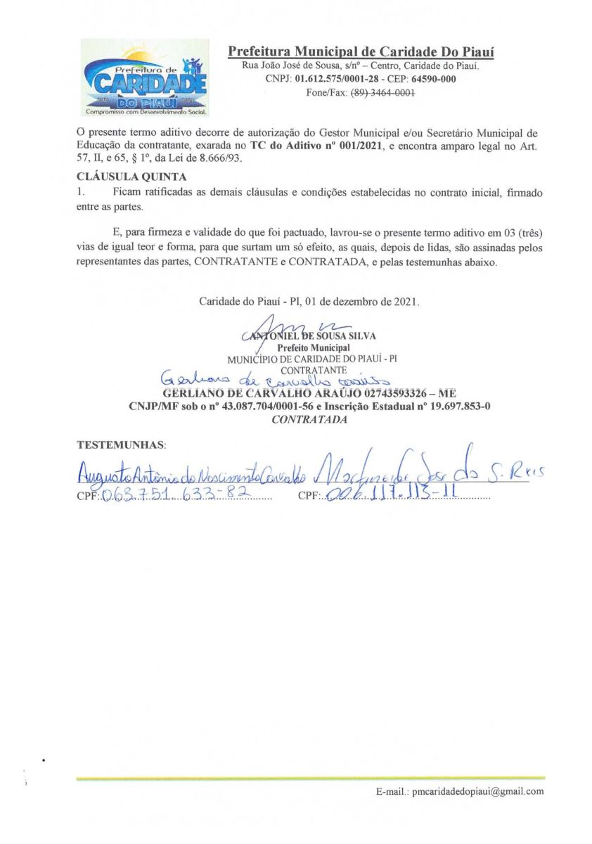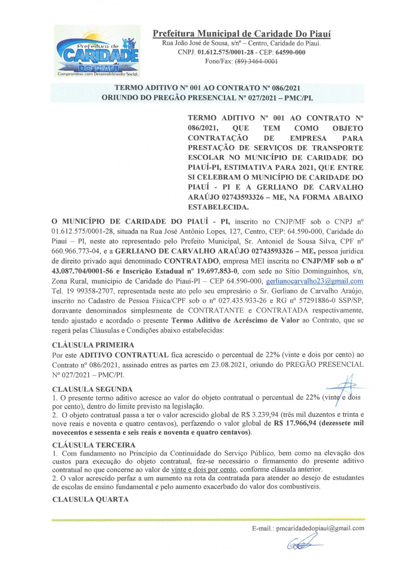 TERMO ADITIVO N° 001 AO CONTRATO N° 086/2021