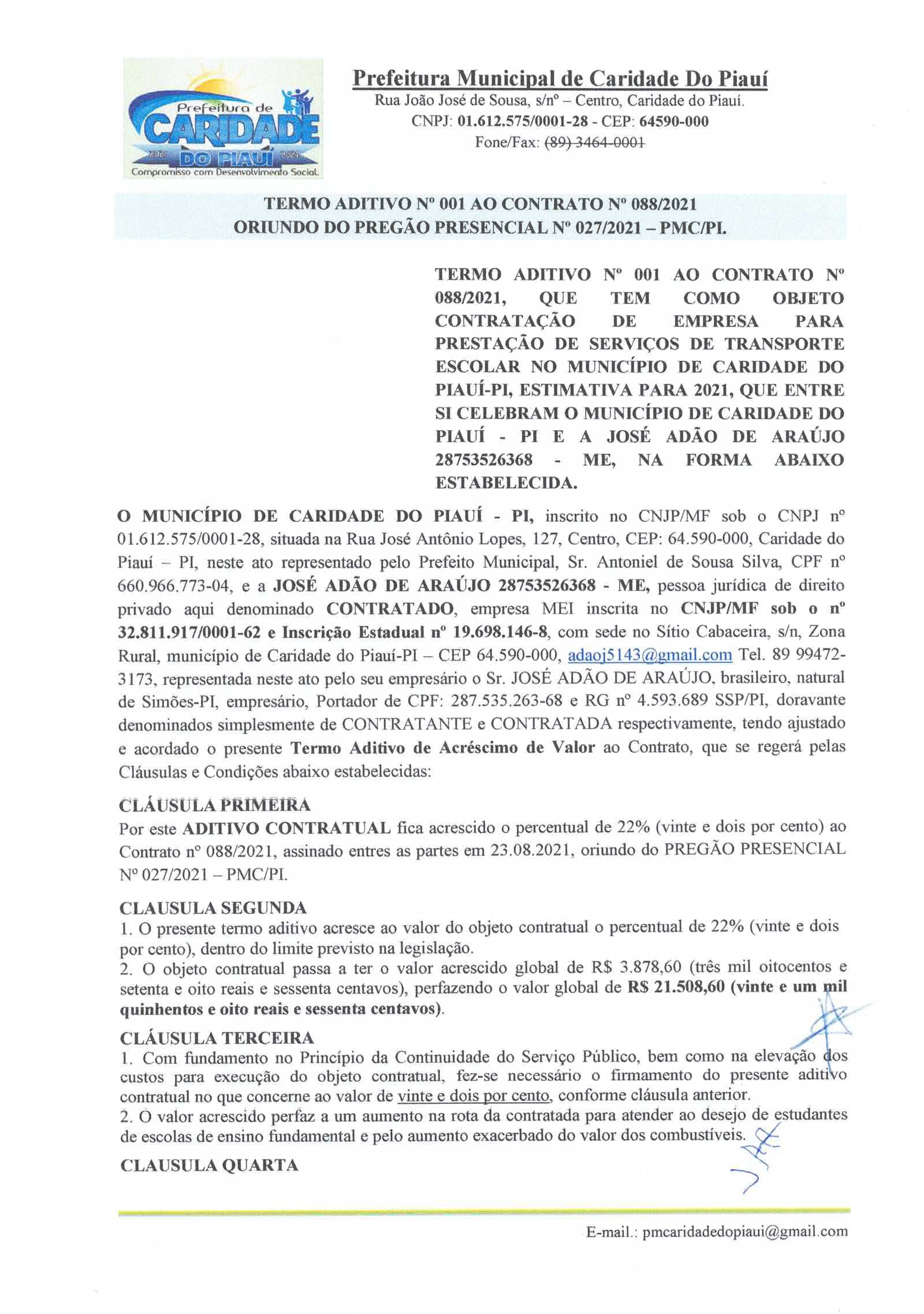 TERMO ADITIVO N° 001 AO CONTRATO N° 088/2021